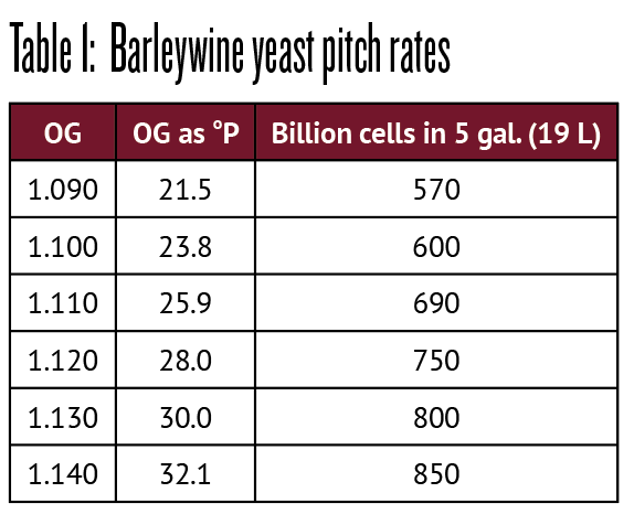 What exactly does “a lot of active yeast” mean? Well, a commonly accepted requirement is to pitch with 1 million cells/mL/°P, (see, for instance, Barley Wine, Fal Allen and Dick Cantwell, 1998, Brewers Publications). For high-gravity beers a rate of 1.4 million cells/mL/°P is suggested in Yeast (Chris White and Jamil Zainasheff, 2010, Brewers Publications), and I would agree with that. This means that 5-gallons (19-L) of barleywine at 1.100 (23.8 °P) needs: