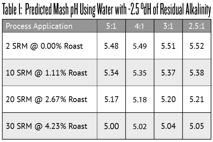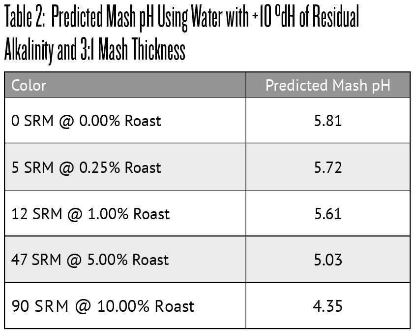 Although the Braukaiser pH shift from color term appears to be based on solid data, it seems to overestimate the effect of malt color on mash pH. Table 2 shows predicted mash pH at a single mash thickness using alkaline water (RA = 10 °dH) over a range of colors and their corresponding roasted malt component. Troester’s plots of mash pH versus beer color in his white paper don’t fall below about 5.1 when color is derived from roasted malt, yet the predicted mash pH from the combination of 10% roasted malt and 90 SRM is 4.35.
