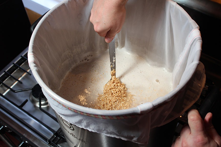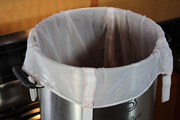 Next, and probably most importantly, is the brew bag. These days there are companies that make brew bags specifically designed for your kettle dimensions, but when I started brewing with this technique the only thing I needed to worry about was not getting one too small. Too big is no problem; many of these mesh strainer bags have strings that you can cinch to keep them tight on the kettle. Or you can always use some binder clips or a bungee cord on the lip of the kettle to keep the extra fabric tucked away. The bags can either be made from cotton or food-safe polyesters and, thanks to the power of the internet, they’re very easy to find. The important thing is that it’s reusable and can hold the weight of the crushed grain when wet without it ripping. I personally never concerned myself with “microns” or how small the holes in the bag are. If it works, it works!