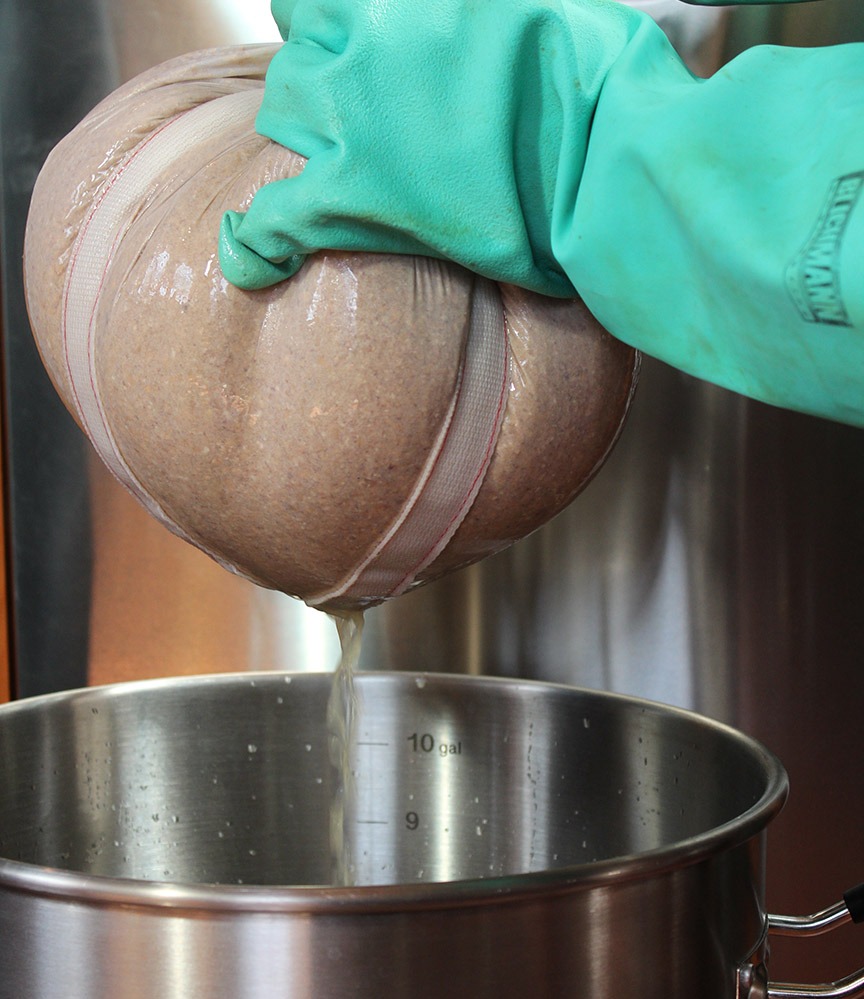 After the mash timer is up it’s time to remove the grains. In other systems you’d likely be removing the wort from the grains and transferring it into a boil kettle. Here we’re doing the opposite. At this point you’ll need some way to remove the bag safely. A pulley makes easy work of it, especially if you have difficulties lifting 11+ pounds (5+ kg) of grain plus any water that’s holding on (which will bring the weight to above 30 lbs./13 kg). When I started, I opted for some heat-resistant gloves, like the ones people use for grilling, and a strong cookie rack. This allowed me to pull up the bag without scorching my hands, then slide in the cookie rack so that it rested on the lip of the kettle, giving me the perfect spot to rest the dripping bag right above the kettle. With some practice you’ll get good at it, so you don’t have to lift the heavy bag so high. This also gives me the chance to squeeze the bag and get every last drop of wort out that I can.