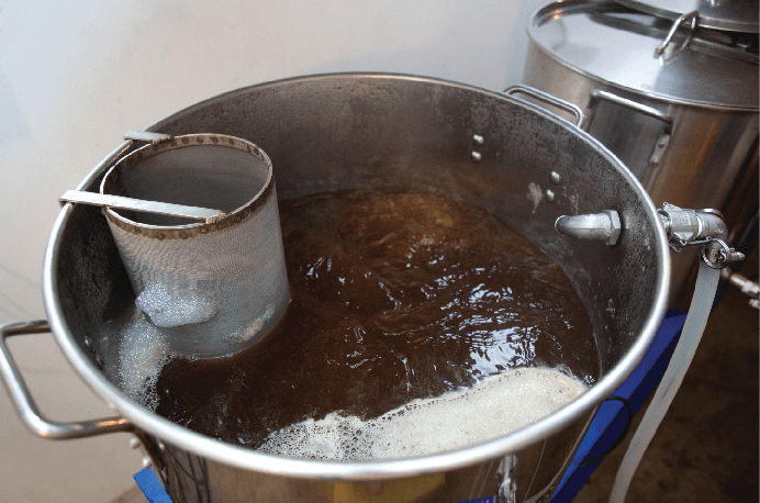 Mash the grains at 150 °F (66 °C) for 45 minutes and then conduct a 170 °F (77 °C) mash out step. Sparge at 170 °F (77 °C) with enough water to collect 6 gallons (23 L) of wort. Total boil time is 60 minutes. After boiling 10 minutes, remove 2 quarts (2 L) of wort and cool to 180 °F (82 °C). Add the dip hops, nettle, and chamomile to your fermenter and then add this cooled portion of wort on top. Close the fermenter with an airlock and leave this portion to rest until the boil is complete.