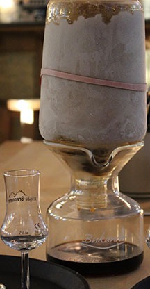 One of the brewery’s regular brews is a classic, golden, malt-dominant Märzen with restrained notes of hops and a standard ABV of 5.7%. Because the brewery does not filter its beers, this Märzen is slightly yeast-turbid. What makes this beer interesting, however, is the way the brewery uses it to make a unique adaptation of an eisbock. Instead of freezing the beer in the fermenter, as is normal for a commercial eisbock, this brewery pours the finished beer into a special glass jug called an Essence of Beer made by Bukanter and freezes it upright for about a day until it is almost solid.