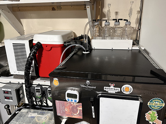 Now it’s time to run all the wires and tubing through those holes. The hole in the rear is access for the two glycol lines, wrapped in pipe insulation, coming in from the pond pumps in the glycol reservoir to the chiller coil in each tank. The middle hole houses the return lines for the glycol returning to the reservoir. Temperature probe wires, power cords from the seedling heat mats and the auxiliary fan, and the blowoff tubes from each fermenter pass through the larger front hole. The two-vessel blowoff setup for each fermenter seen on top of the freezer is an extra layer of protection from oxygen and/or sanitizer suckback as fermentation slows, prior to pressurizing the fermenters to cold crash. The first bottle is empty and allowed to fill with CO2. The second has tubing submerged in sanitizer creating the airlock. The “S” bubbler on top is unnecessary, but I just like to see the bubbling. On the note of necessity, notice the metal strapping that anchors the unit to the wall using the freezer door mounting holes. Extending the shelf with a full fermenter in it could be a catastrophic undertaking without it being adequately secured to the wall studs.