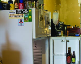 If you’re one of those crafty brewers looking for project inspiration, meet Frankenfridge. Frankenfridge is a conglomerate of regular household items along with retail homebrewing equipment that accomplishes all those tasks, and then some. Its body consists of a 13 cu/ft (0.4 cu/m) upright freezer and an old dorm fridge with a wooden extension collar. Inside the freezer functioning as the main fermentation chamber is a spine made of PVC boards and laminated wood shelving rescued from a neighbor’s trash, and a set of locking drawer slides. Resting in and protected by the spine are two 7-gallon (27-L) Tri-Conical FermZilla tanks. Each tank is fitted with a temperature twister cooling coil, FermZilla thermowell, and stainless steel pressure kit as well as a FermZilla stainless tri-clamp reducing elbow and a lightweight 1.5-inch tri-clamp butterfly valve from BrewHardware. The accompanying chamber next to it is made from an old dorm fridge. It functions as a brite tank chamber and houses an 8-gallon (30-L) FermZilla All Rounder fitted with the same chiller coil, thermowell, and stainless pressure kits as the other tanks.