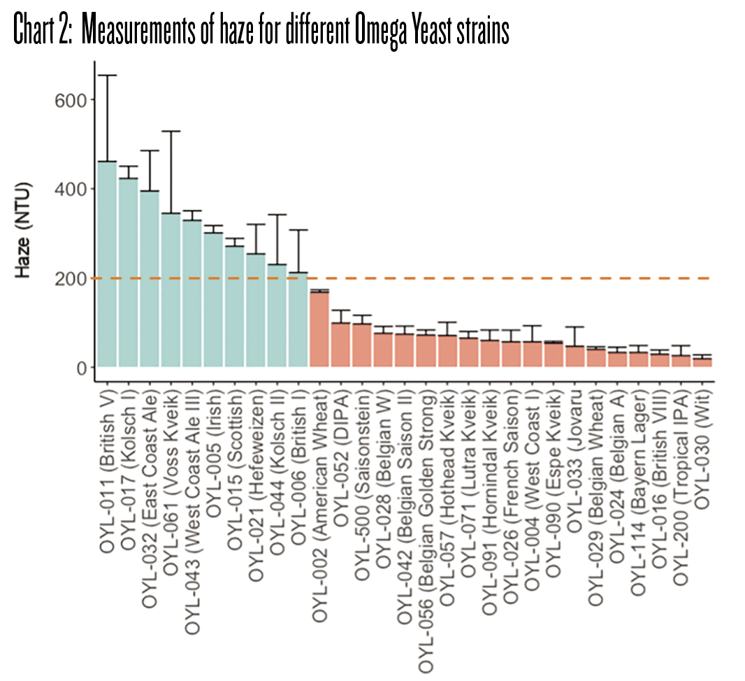 When we looked at the rest of our strain collection, we found that British V was not unique and there were a handful of brewing strains that produced significant haze. In our flask fermentations, yeast that produced >200 NTUs (nephelometric turbidity units) with a late fermentation dry hop at 8 g/L (about 2 lbs./bbl or 5 oz. per 5 gallons) were termed “haze-positive” (blue in Chart 2). There is extremely useful information in this chart. You wouldn’t want to bang your head against the wall trying to make hazy IPA with Chico, for example. You might be able to get mildly hazy beer by utilizing adjuncts like oats or wheat, but you’re not going to get orange juice-level haze with Chico. Conversely, if you’re attempting a modern take on a crystal clear Kölsch-style beer by including a dry hop and Kolsch I (OYL-017) is your strain of choice, it is going to be exceedingly difficult to get it clear because Kolsch I is genetically prone to haze in combination with dry hopping. Don’t fight genetics!