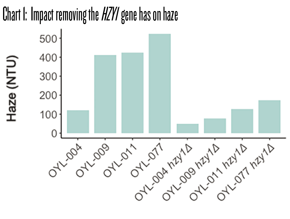 The measurements of haze with different Omega yeast strains before and after the HZY1 gene is removed.
