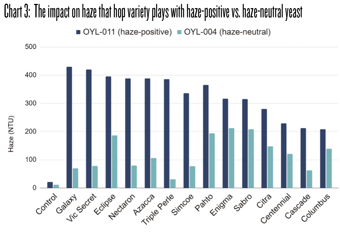 This part of the research is surprising and likely provides some clues into how dry hopping is leading to the yeast-dependent haze. What component of the hops is providing the signal or is part of the haze particle? We don’t currently know why, but different hop varieties lead to different amounts of haze with various combinations of haze-positive and haze-neutral yeast (see Chart 3). Some varieties of hops, like Enigma® and Sabro®, provide a decent amount of haze even when used with a haze-neutral yeast. Some varieties, like Galaxy®, provide huge amounts of haze when used with haze-positive yeast strains but provide very little haze when used with haze-neutral strains. Hop suppliers might be onto something with hop products that stabilize haze and we are keeping a close eye on their findings.