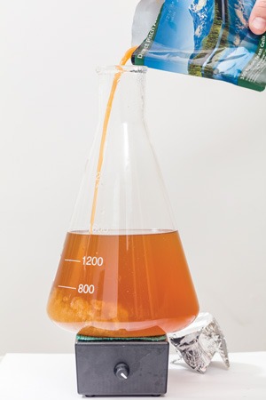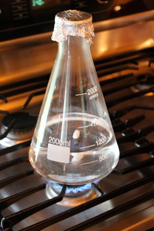 - Boil starter wort 20 minutes to sterilize. Use a saucepan on a kitchen stove; if using a laboratory-grade glass flask, you may be able to boil directly in the flask (as seen in step 5) — double check with your supplier or the manufacturer first. Use foam control drops (step 4) to prevent foam from boiling up in the flask.