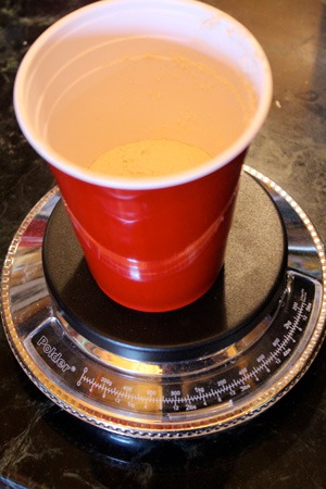 - 3.5 oz./100 g plain dried malt extract (DME) (approx. ½ cup). Tip: measuring into a plastic cup (as seen in step 2) makes transfer into the flask easier as you can crease the side of the cup (see step 3 below).