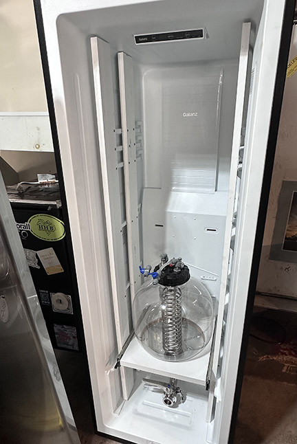 As the project comes to completion, you can see the 110V auxiliary computer fan mounted in the top right corner to keep air moving and maintain even temperature throughout the chamber. Down from it is the temperature probe for the chamber itself, with the water-filled soda bottle for some thermal mass as mentioned earlier. You’ll also notice the molded shelving brackets on the inside of the door have been cut flush and covered with a foil tape to increase the clearance inside for the tanks and drawers.