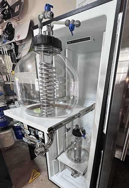 The heart is a 5,000-BTU window air conditioner (AC) unit with its blower fan removed and evaporator coil carefully re-oriented to fit into a 28-qt. (26.5-L) Igloo cooler. The heart is responsible for keeping the 65% distilled water/35% food-grade inhibited propylene glycol flowing through the system. Inside the cooler are three 550-GPH submersible pond pumps meant for outdoor fountains or fishponds, whose job is to recirculate the glycol solution to the stainless chiller coils for each of the three tanks and back to the cooler reservoir through insulated tubing.